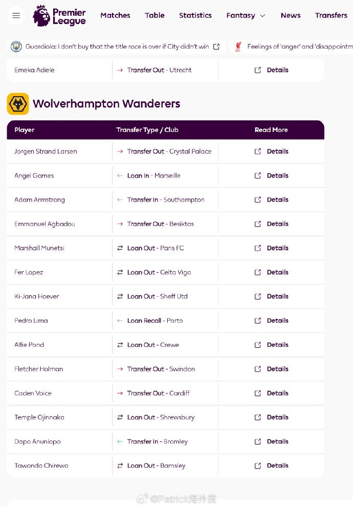 2月9日讯 据博主“Patrick海外君”消息,英超官网2026年冬窗转会列表,徐彬加盟狼队和租借巴恩斯利均未列入。